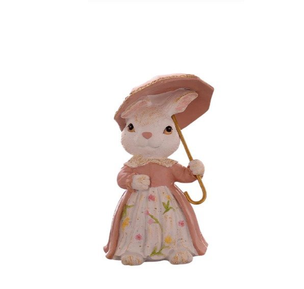 Com um design encantador e a sua elegante sombrinha, esta coelha adapta-se facilmente a qualquer espaço da casa, como salas, entradas, prateleiras ou mesas decorativas, podendo também complementar a decoração em varandas ou jardins.