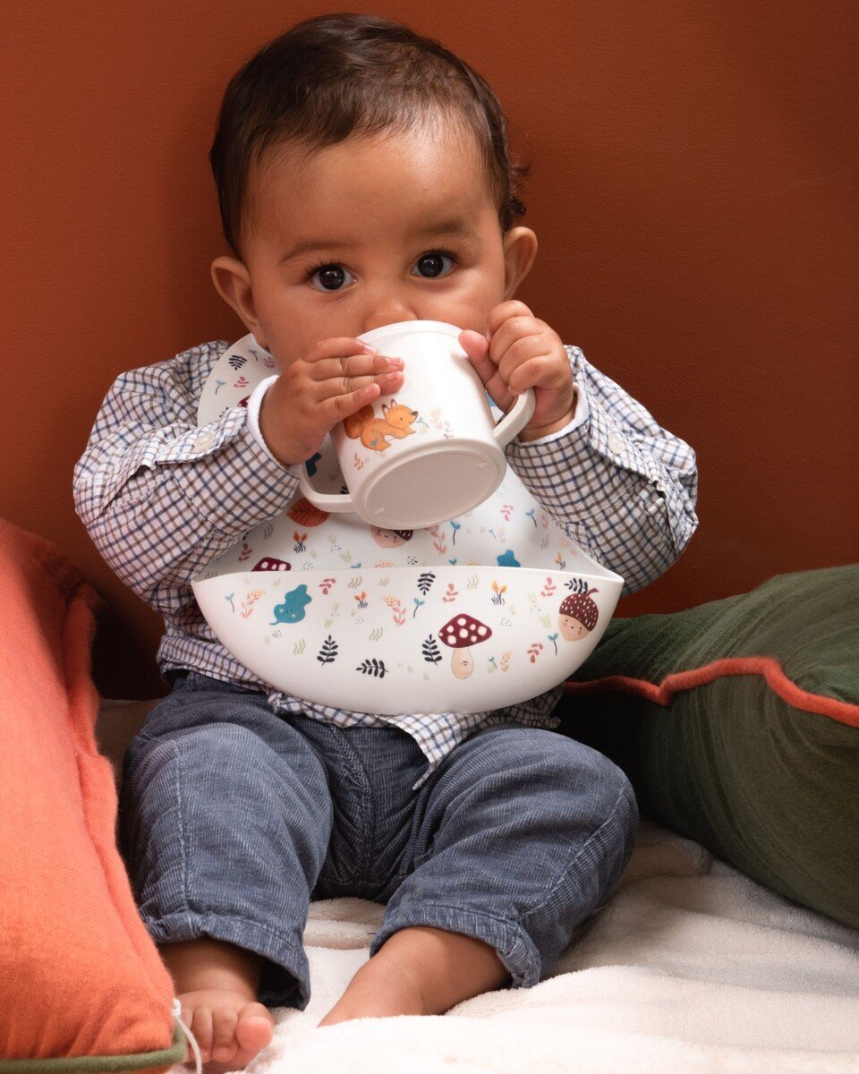 Conjunto de 2 babetes de silicone LFGB, concebidos para garantir a segurança alimentar e facilitar a manutenção. Este conjunto inclui um modelo em terracota e um modelo branco estampado com cogumelos coloridos, adequados para crianças. Dimensões práticas (27 x 21 cm) e fecho ajustável para um bom ajuste. Produto durável, lavável e resistente, ideal para enriquecer uma gama moderna e funcional de têxteis para a mesa infantil.