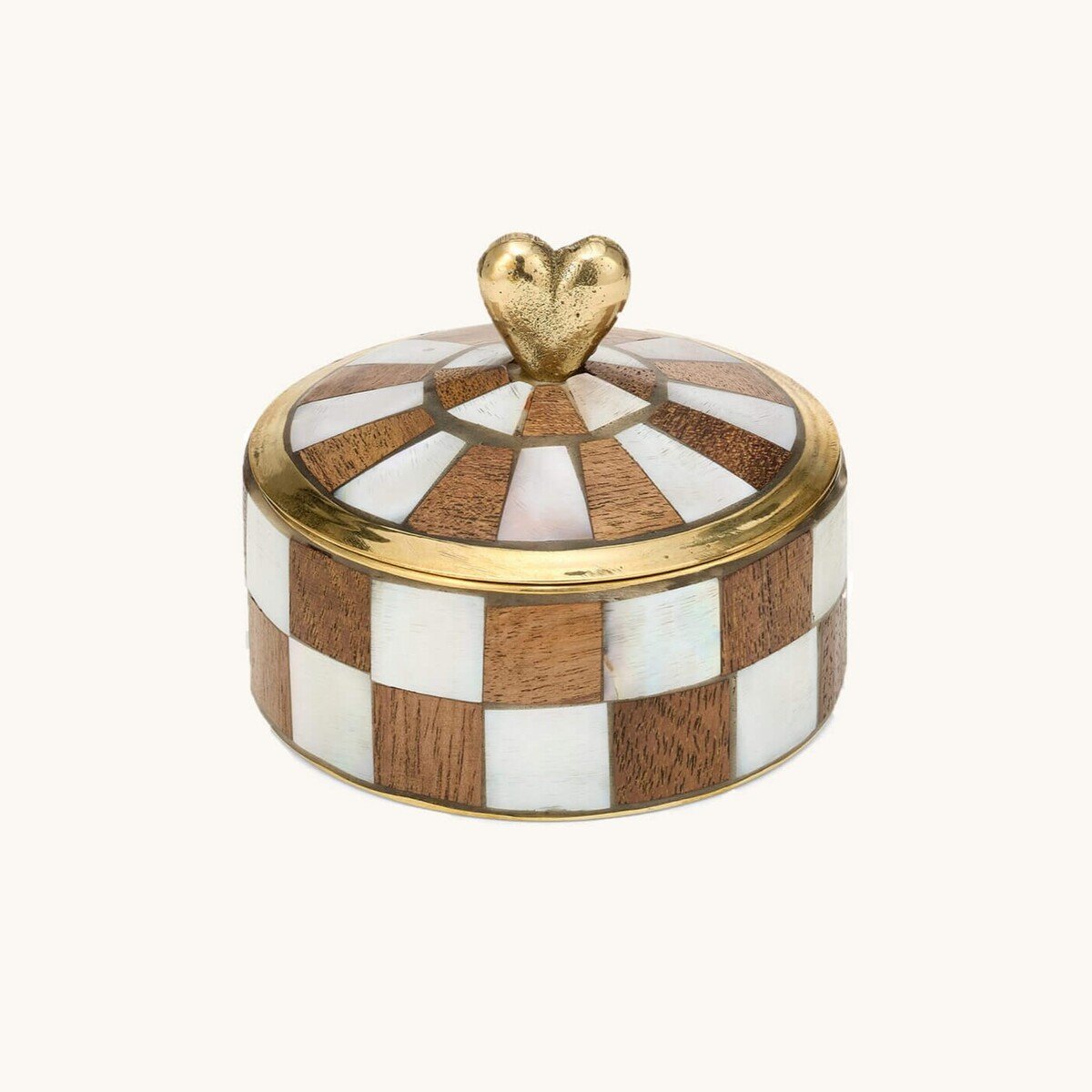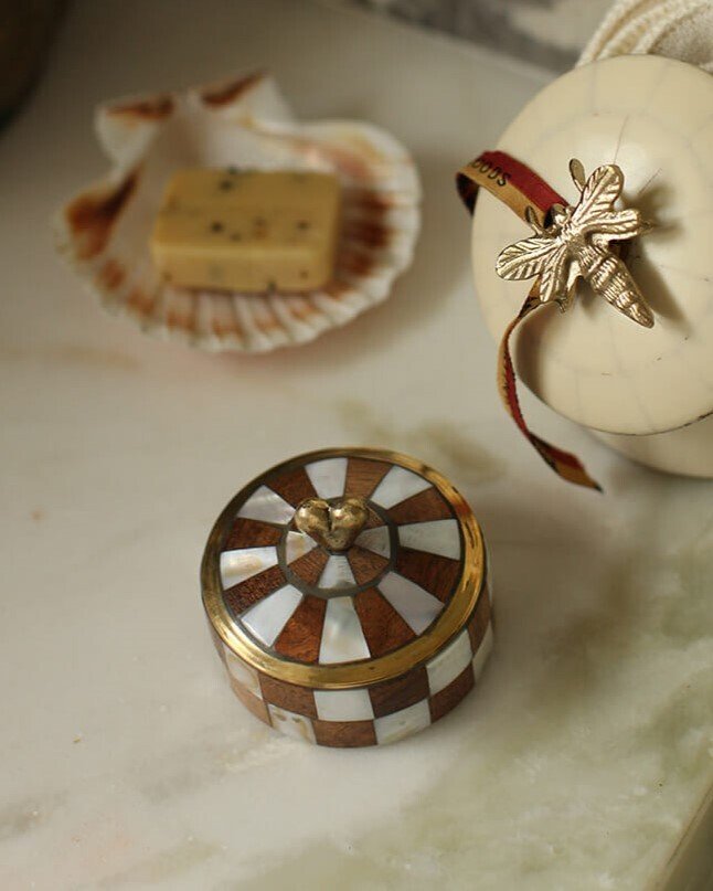Esta encantadora peça de armazenamento é meticulosamente trabalhada em concha e madeira.
