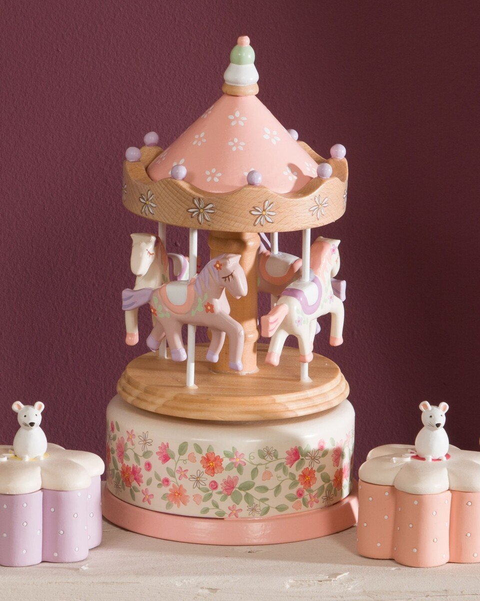 Os seus pequenos cavalos em tons pastel giram delicadamente, dando um toque mágico e nostálgico ao quarto do seu filho.