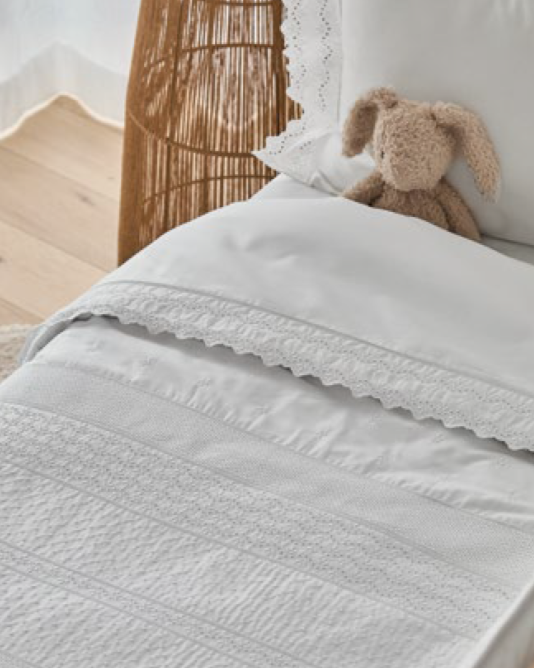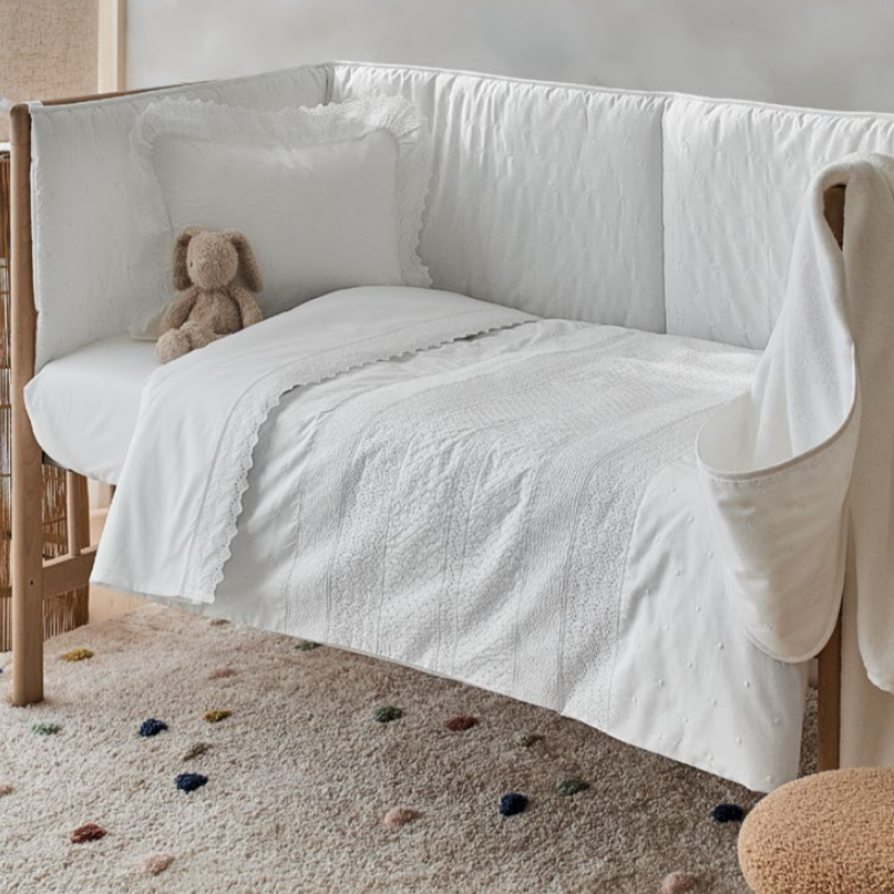 Apresenta bordado branco, garantindo um acabamento clássico e sofisticado. Disponível apenas em branco, harmoniza com qualquer decoração de quarto de bebé.