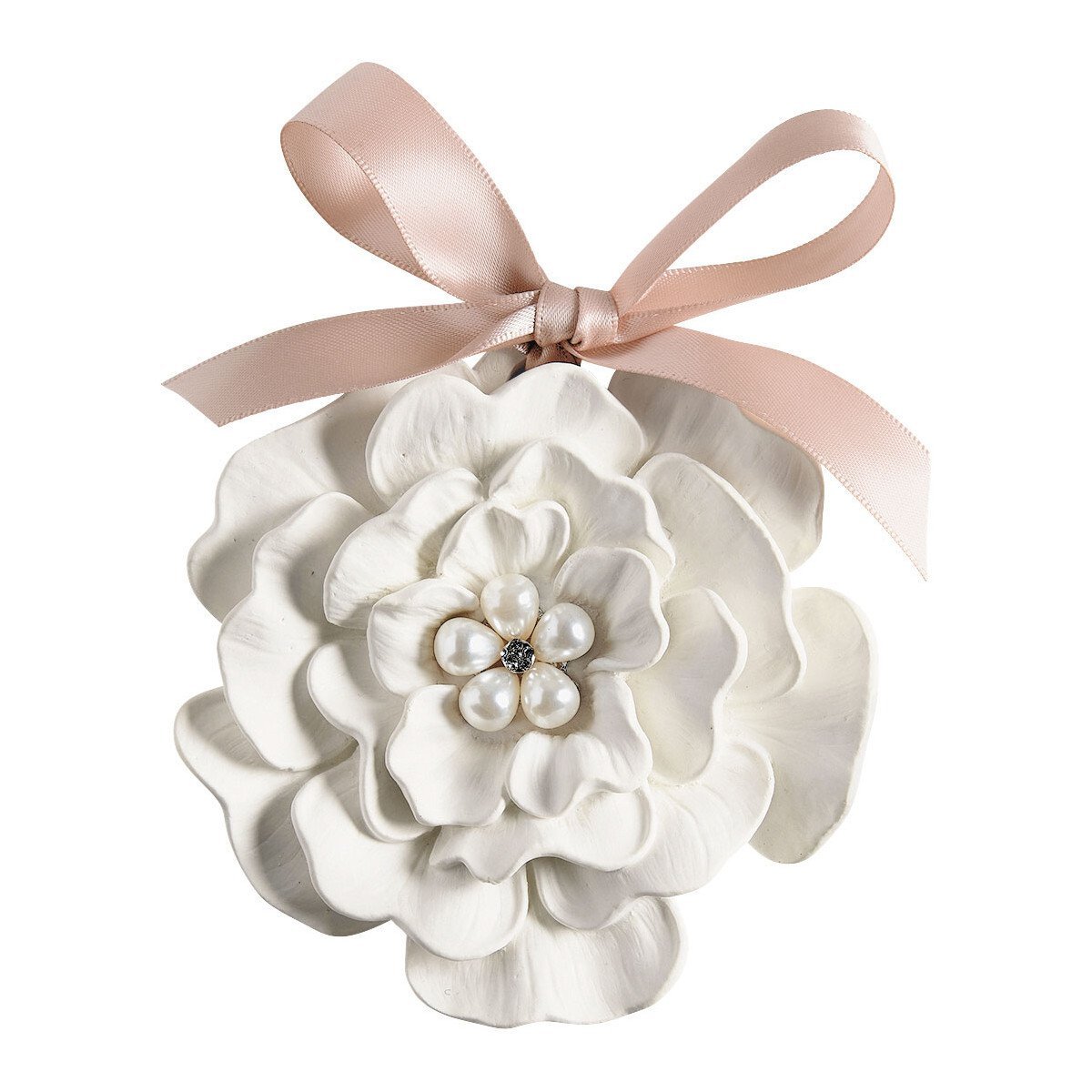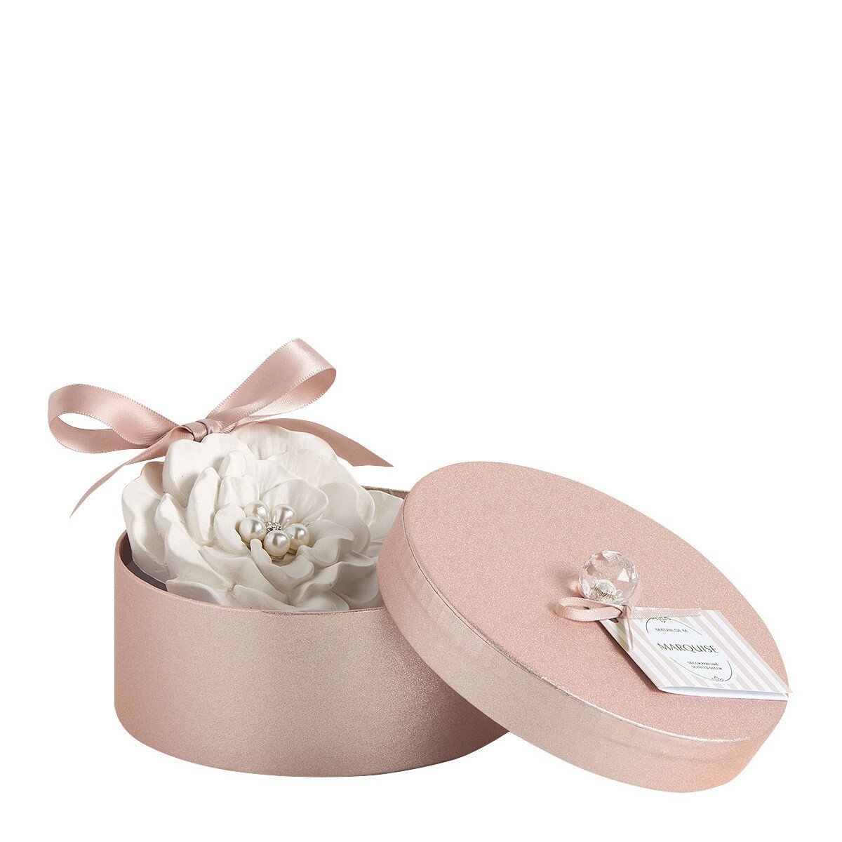 Este encantador conjunto para presente é composto por uma generosa flor perfumada em gesso esculpida à mão, adornada com uma joia de pérolas no centro. Perfumará delicadamente todos os pequenos espaços da sua casa, como roupeiros, gavetas ou malas, durante muito tempo. Deixe-se seduzir pela delicada cor rosa pérola que adorna este conjunto de oferta.