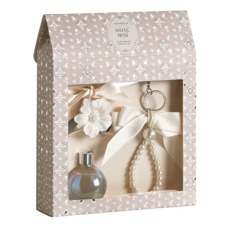 Este coffret contém um difusor de perfume ambiente, uma bonita decoração em gesso perfumado minuciosamente trabalhada à mão e um porta-chaves em pérolas. Uma ideia irresistível para oferecer ou simplesmente para se mimar!