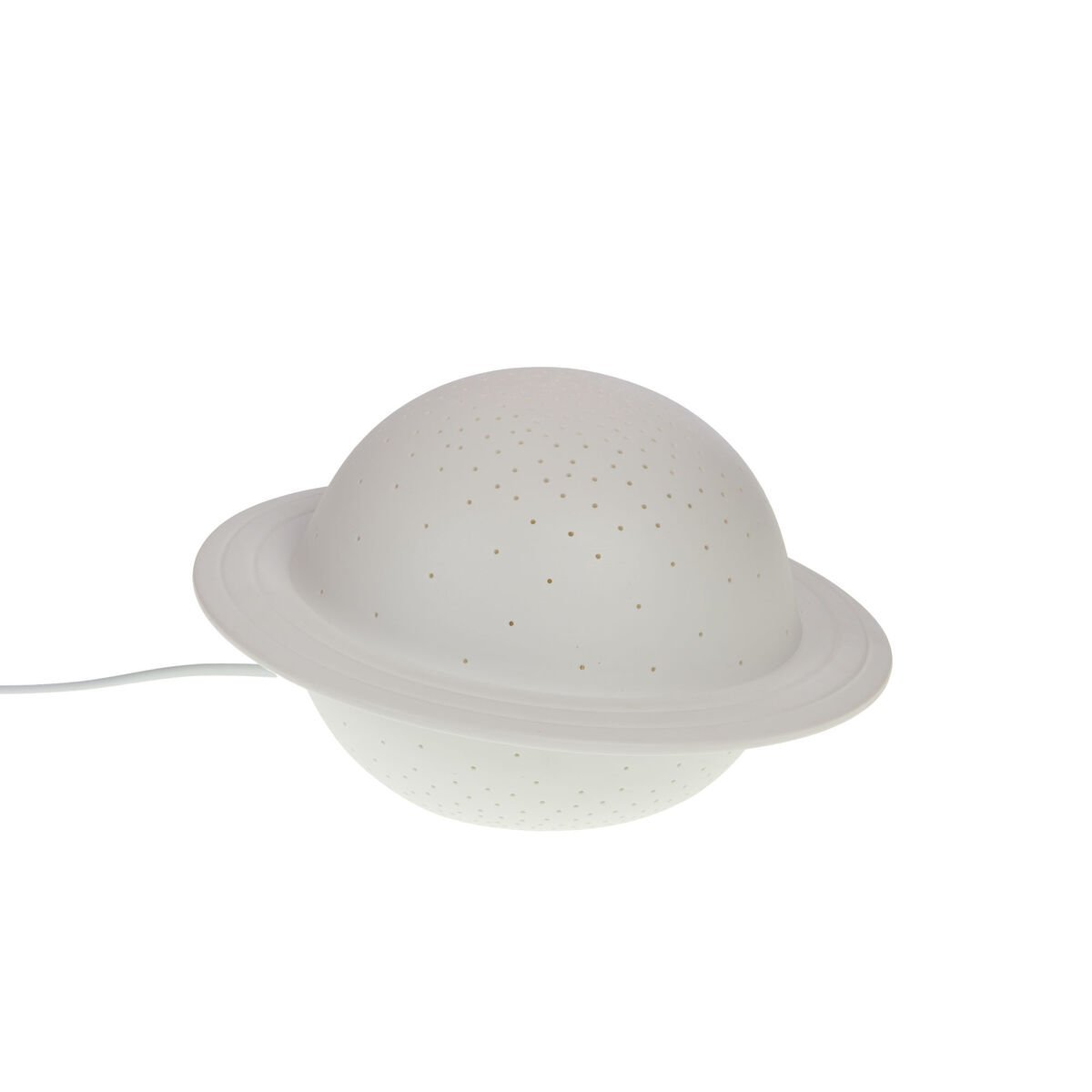 O candeeiro «Saturno» em porcelana apresenta um design original que evoca o planeta Saturno com o seu anel luminoso. Com dimensões compactas (23x23x14 cm), é adequado para utilização como luz noturna ou candeeiro ambiente. Este produto elétrico pronto a usar é ideal para enriquecer uma gama de decoração contemporânea e refinada, atraindo uma clientela em busca de objetos decorativos e funcionais de iluminação.