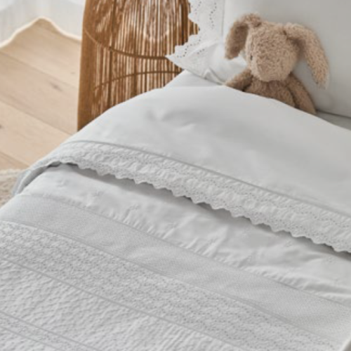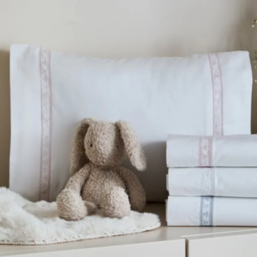 Apresenta bordado refinado, disponível em três opções de cor: branco, azul ou rosa, permitindo personalizar o quarto com um detalhe subtil e sofisticado.