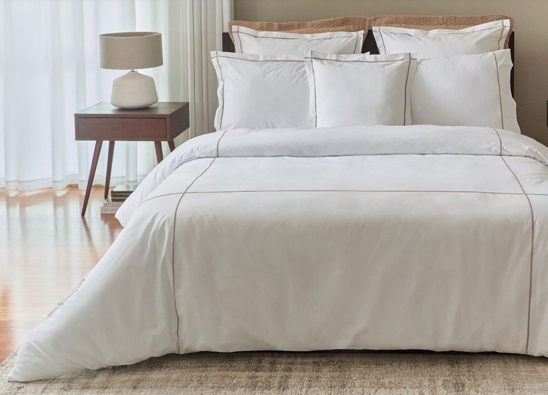 O lençol de cima é sempre na cor branca contundo o rolinho está disponível em 6 tons diferentes: Branco, Taupe, Cinza, Azul Francês, Blush & Azul Marinho. O mesmo rolinho está nos 2 cantos das almofadas.