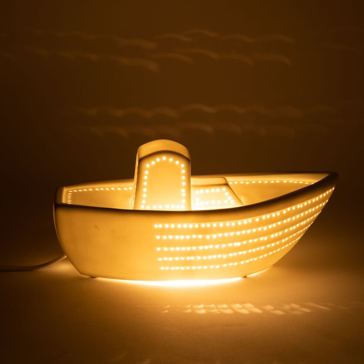 Traga um toque de magia e tranquilidade ao quarto das crianças com este encantador candeeiro em formato de barco. Fabricado em porcelana de alta qualidade, este candeeiro combina delicadeza, segurança e um design divertido pensado especialmente para o público infantil.
