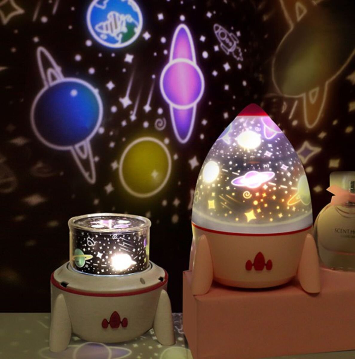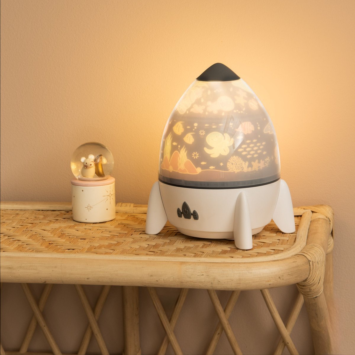 Dê um toque de ternura e imaginação ao quarto do seu filho com este projetor musical em forma de foguetão. A sua luz suave e as suas melodias relaxantes criam um ambiente propício ao sono e à brincadeira. Compacto e leve, integra-se facilmente numa estante ou numa mesa de cabeceira. Design branco neutro, perfeito para meninos ou meninas.